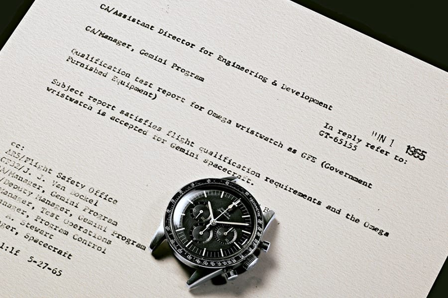 ในช่วงต้นทศวรรษ 1960 นาซาต้องการนาฬิกาข้อมือกลไกลเป็นอุปกรณ์สำรองให้กับระบบดิจิทัลของนักบินอวกาศ และได้เชิญผู้ผลิตนาฬิกาสี่แบรนด์ให้ส่งนาฬิกามาทดสอบคุณสมบัติในสภาวะขั้นสุดขั้วของอวกาศ นาฬิกาทุกเรือนต้องผ่านการทดสอบในห้องปฏิบัติการทั้งความร้อนสูง ความเย็นจัด แรงสั่นสะเทือน แรงดันสูญญากาศ และความชื้น โดยมีรายงานว่านาฬิกาแบรนด์อื่นทั้ง Hamilton (นาฬิกาตัก) Rolex และ Longines ตกรอบตั้งแต่ขั้นทดสอบแรกๆ และ มีเพียง Omega Speedmaster เท่านั้นที่รอดทุกการทดสอบ ผลจากการทดสอบในปี 1965 นี้ทำให้ Speedmaster ได้รับการรับรองอย่างเป็นทางการจาก NASA ว่าสามารถใช้ในภารกิจอวกาศมนุษย์ทุกชุด รวมถึงการออกปฏิบัติงานนอกยาน (EVA)
